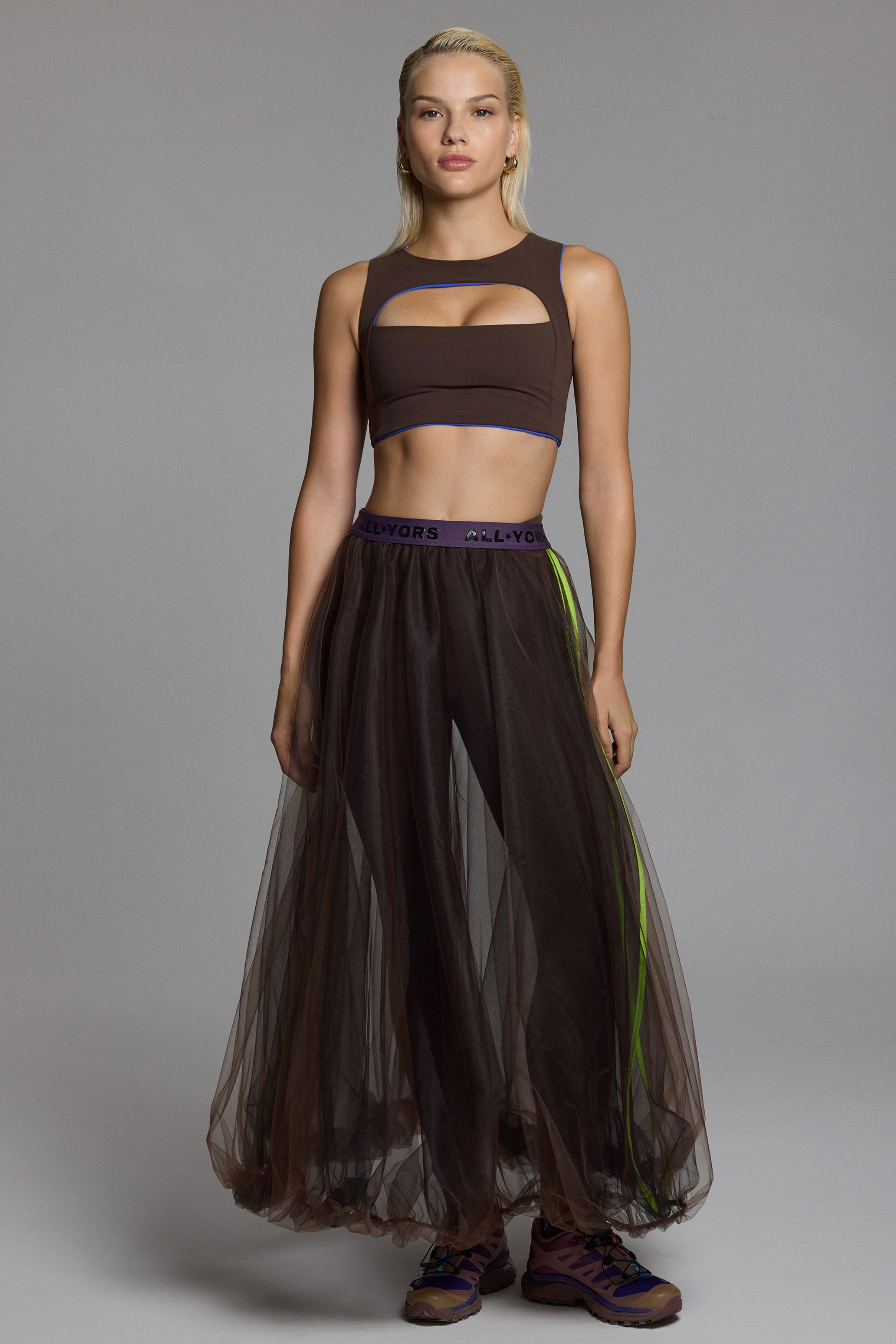 Hafif ve hacimli tül dokusu sayesinde yürüdükçe birlikte hareket ediyor, her adımda dinamik ve feminen bir silüet yaratıyor. Esnek, logolu beli hem konforlu bir kullanım sağlıyor hem de eteğe sportif ve modern bir hava katıyor.