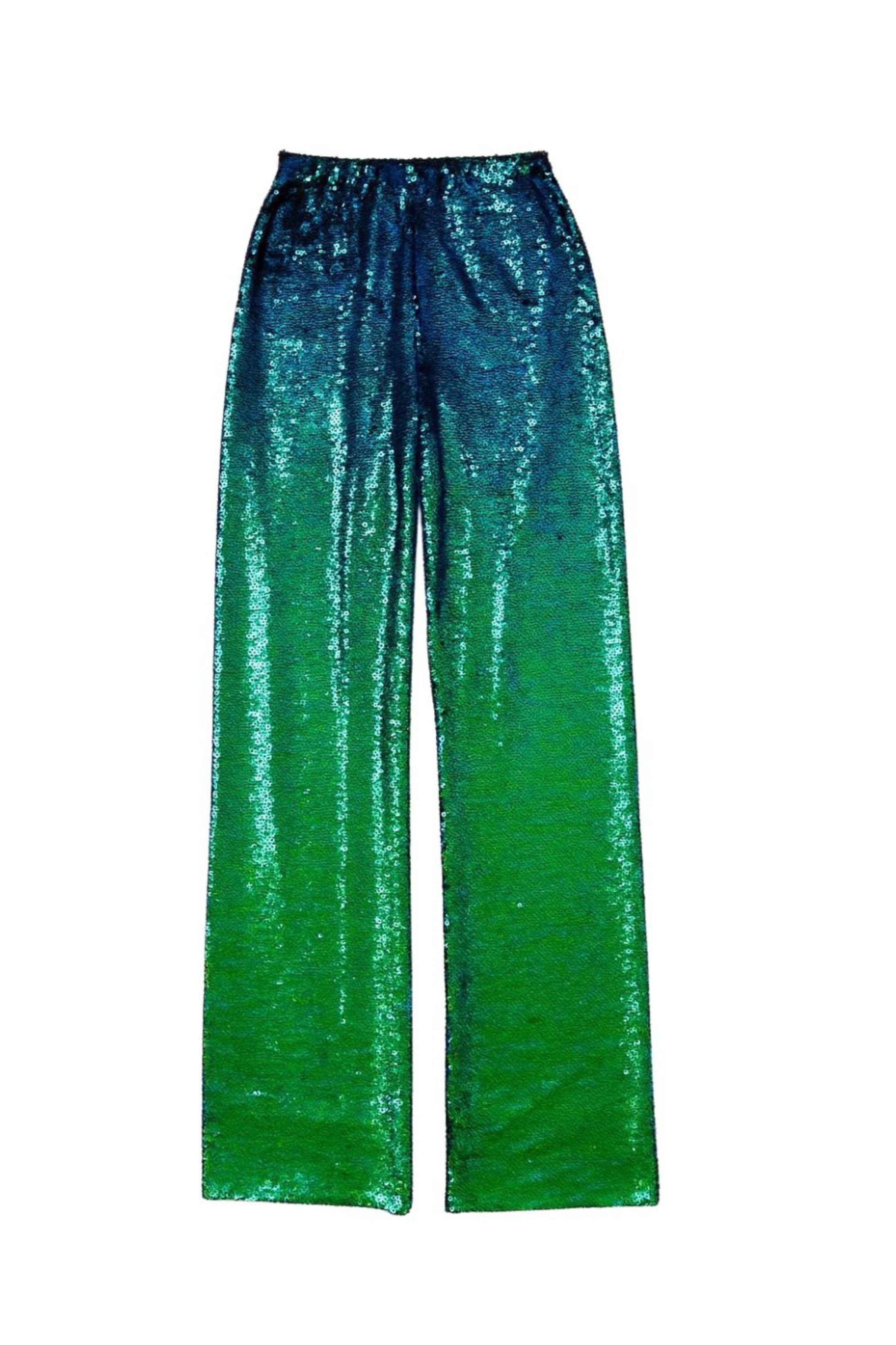 Bu mavi-yeşil geçişli payetli pantolon, disko enerjisini modern bir çizgiyle yeniden tanımlıyor. Akışkan kesimi ve tam boy formu, vücuda zarifçe otururken her adımda farklı bir ışıltı yansıtır.