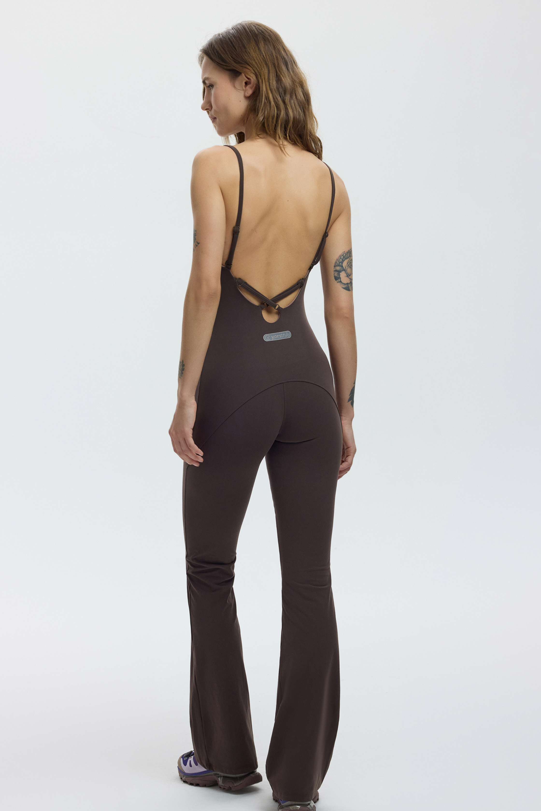 Bedeninizi saran esnek kumaşı sayesinde yoga, pilates ve günlük kullanımda maksimum konfor sağlar. Paçalarda hafif genişleyen kesim, vücudu dengeleyen zarif bir akış yaratır. Sırt kısmındaki detaylar ve minimal logo uygulaması ise bu tulumu sıradan spor parçalarından ayırarak güçlü bir stil ifadesine dönüştürür.