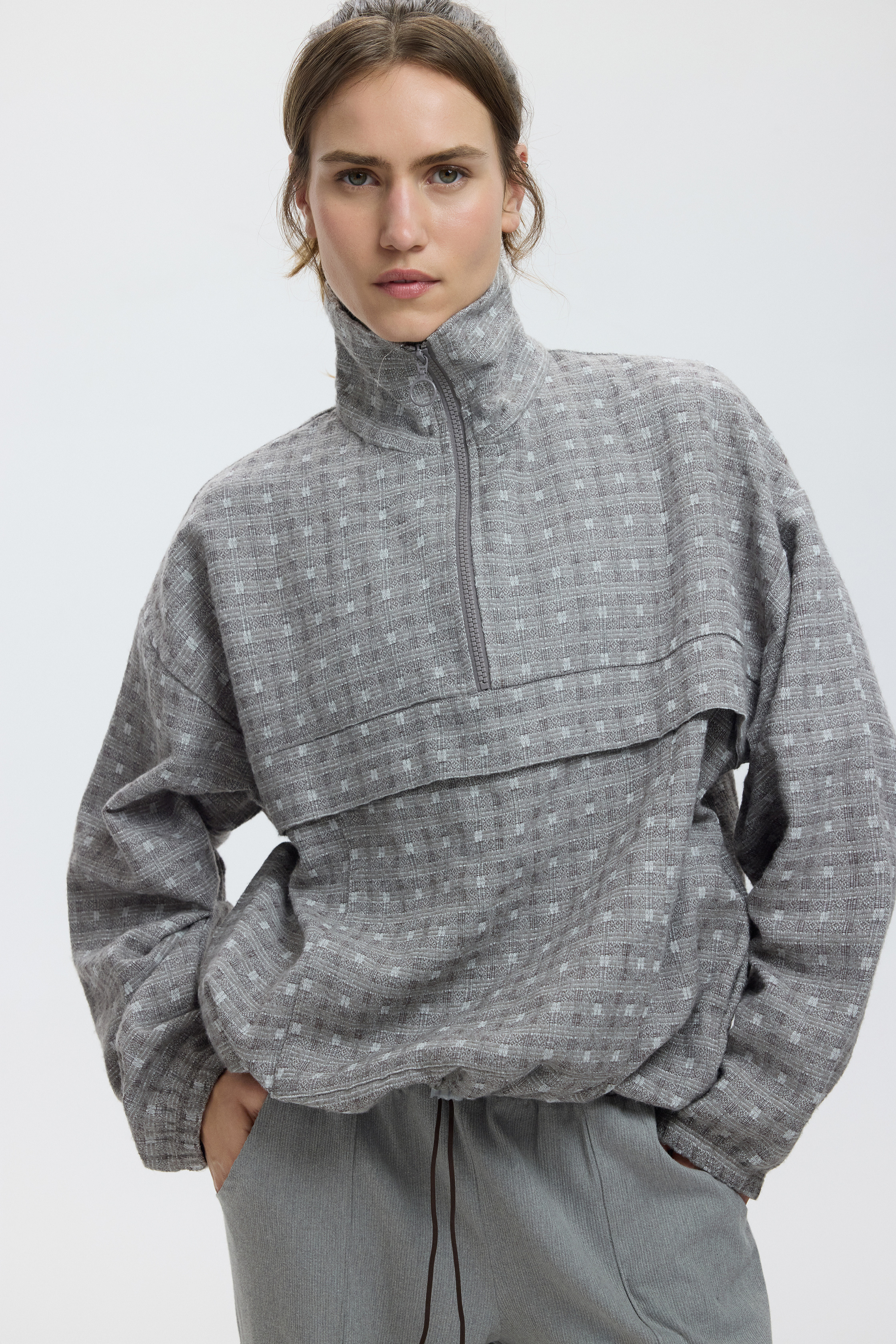 Yumuşak yüzeyiyle konforlu, modern kesimiyle özgür. Beli büzülerek form kazandırılabilir ya da bol bırakılarak rahat bir siluet oluşturabilir. Gri tonlarının “ash grid” dokusuyla birleştiği bu parça, sade görünümlere yeni bir enerji katıyor.