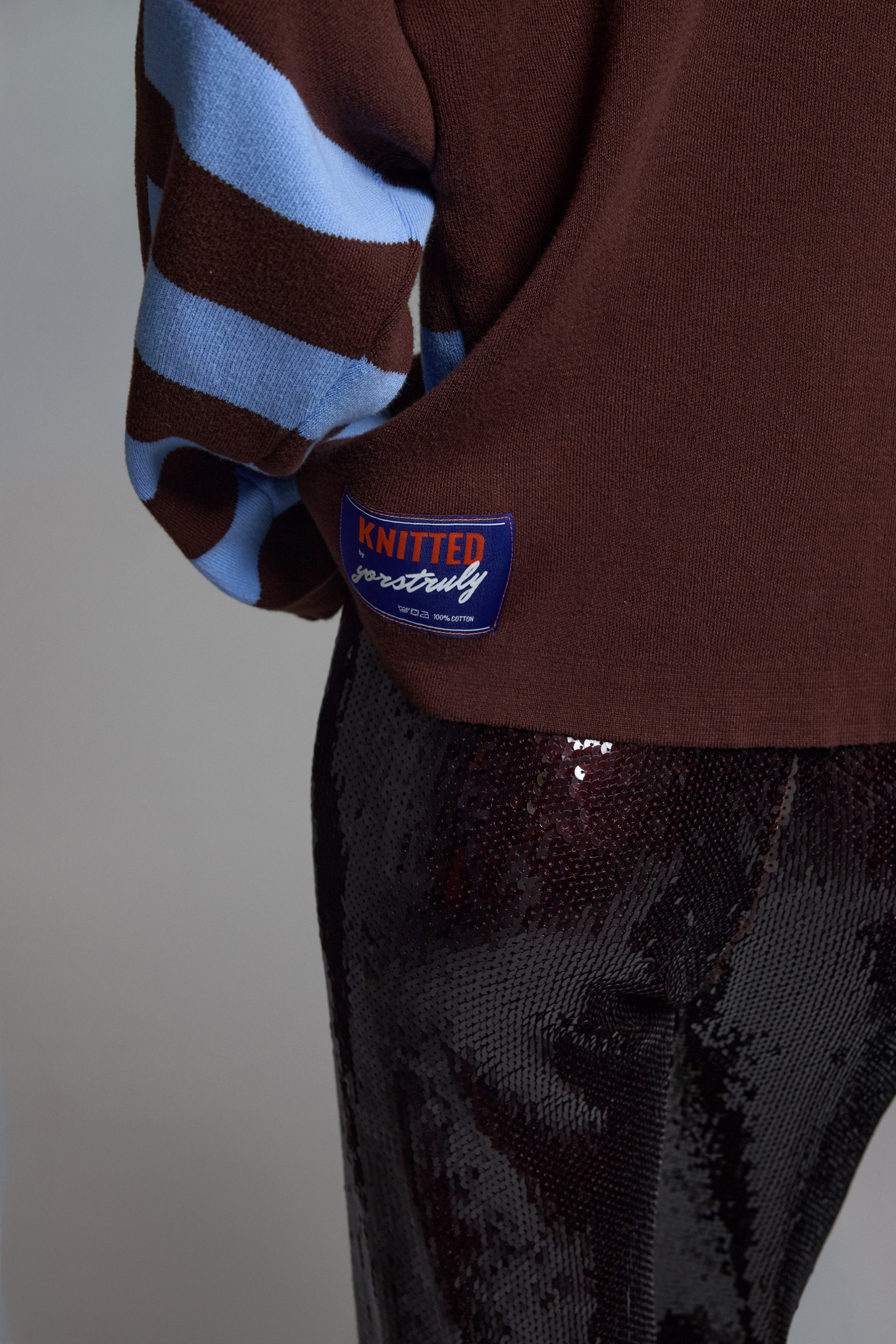 Bu kahverengi ve mavi geniş çizgili triko, spor bir siluetle zamansız bir renk kontrastını bir araya getiriyor. Yumuşak dokusu ve oversize kesimiyle rahat bir duruş sunarken, düğmeli yaka detayı tasarıma nostaljik bir karakter kazandırıyor.