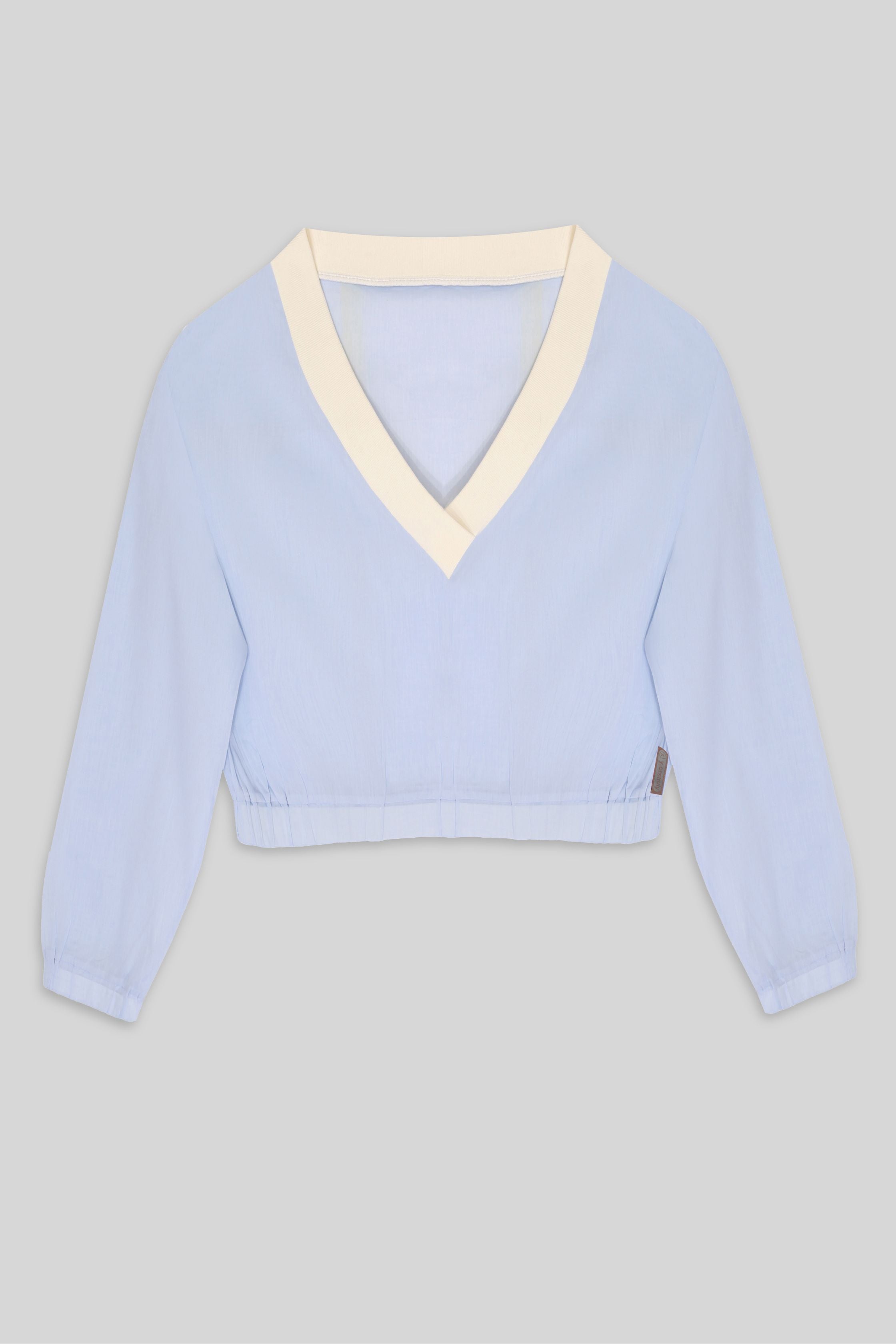- Renk: Soft mavi gövde, krem yaka detayıyla tamamlanır